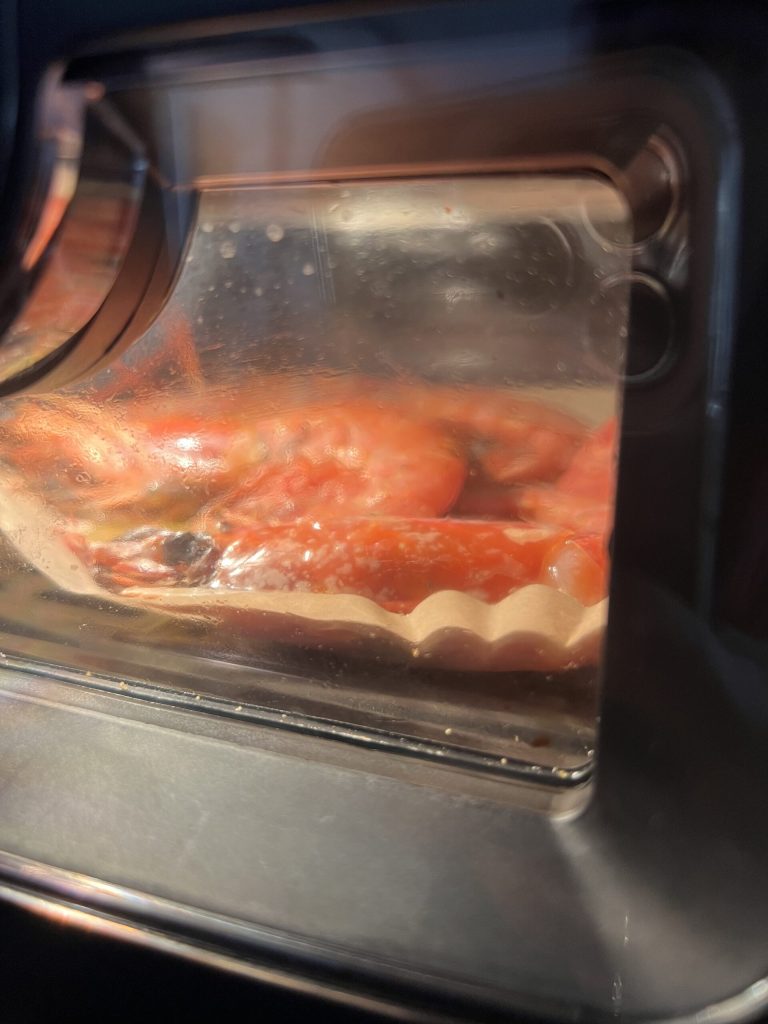 • Wir kochen bei 190 Grad für 10 Minuten und wenden die Garnelen zur Hälfte der Kochzeit. Auf diese Weise werden sie innen weich und saftig und außen gut durchgebraten.