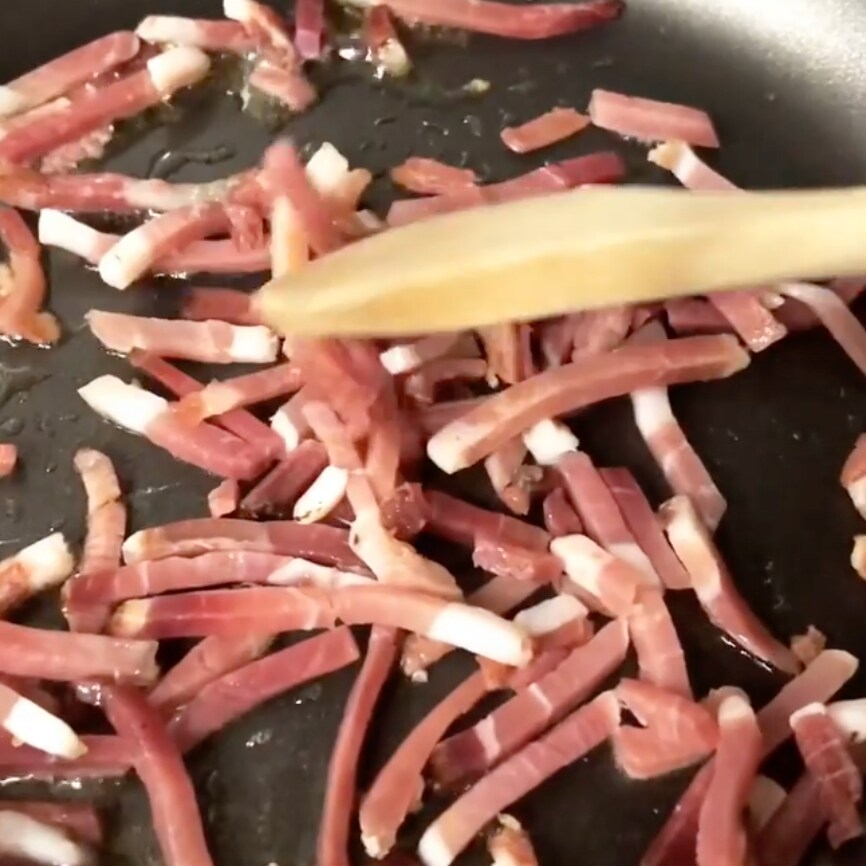 Lassen wir die Kartoffeln mit dem Speck für einige Minuten kochen, bis sie leicht geröstet sind. Wir fügen kein Salz hinzu, da der Speck bereits salzig ist.