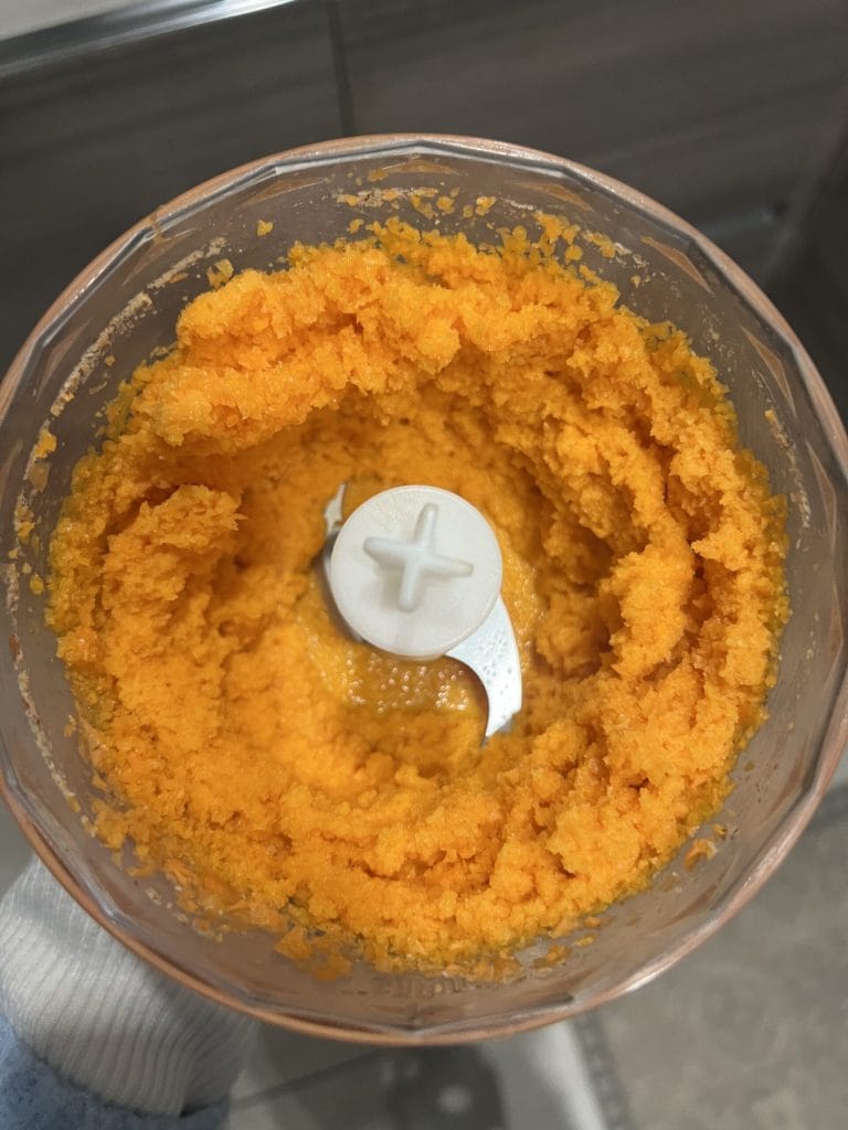 • Zuerst waschen und schälen wir die Karotten. Im Mixer mahlen wir die Mandeln zu Pulver (wenn wir kein bereits fertiges Mandelmehl haben) und stellen sie beiseite. Schneide die Karotten in Stücke und gib sie zusammen mit der Hälfte des Öls in den Mixer, um eine schöne glatte Konsistenz zu erreichen.