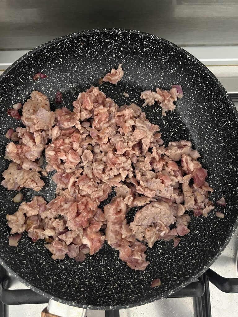 In einer Pfanne die fein gehackte Zwiebel mit etwas Öl erhitzen. Den Darm von den Würsten entfernen und in die Pfanne geben, sie mit einer Gabel zerdrücken oder mit einer Schere so fein wie möglich hacken. Wenn sie gut angebraten sind, mit Weißwein ablöschen und verdunsten lassen.