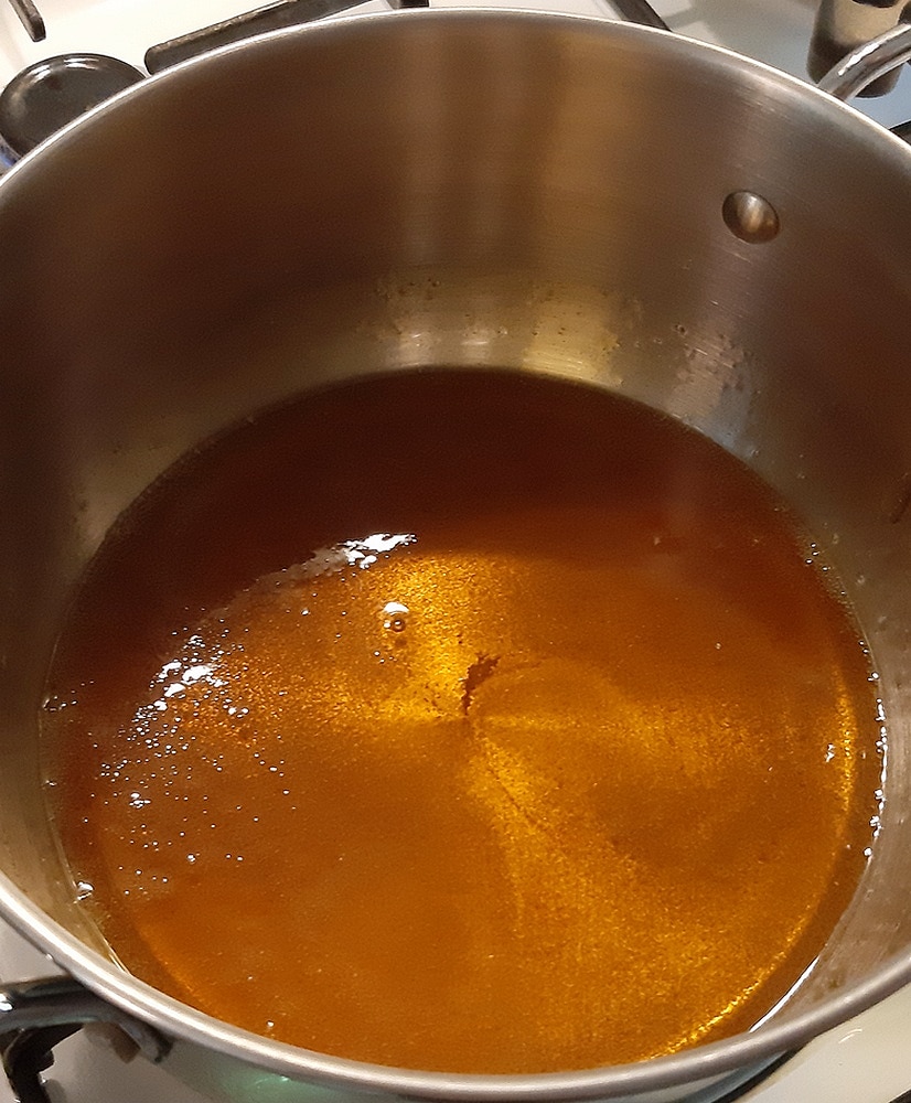 Wenn der Zucker geschmolzen ist und anfängt, Farbe zu bekommen (Foto 2), erhitzen Sie in einem kleinen Topf oder im Wasserkocher 150 g Wasser (es muss kochend sein).