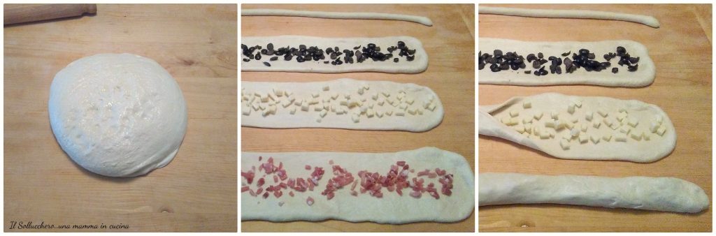 Teilt den restlichen Teig in drei gleich große Teile, formt drei etwa 45 cm lange Rollen und rollt sie mit dem Nudelholz zu Rechtecken mit einer Höhe von 8–10 cm aus. Belegt jedes Rechteck mit einer anderen Füllung (Oliven, Käse und Speck), rollt sie auf und verschließt die Enden, indem ihr sie mit den Händen festdrückt.