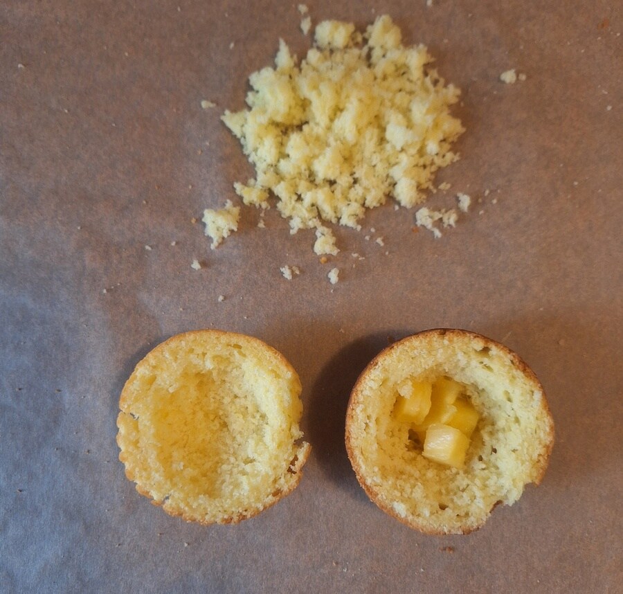 Füllen Sie das Innere des Muffins mit ein paar Ananaswürfeln (oder Erdbeeren oder einer Amarena-Kirsche).