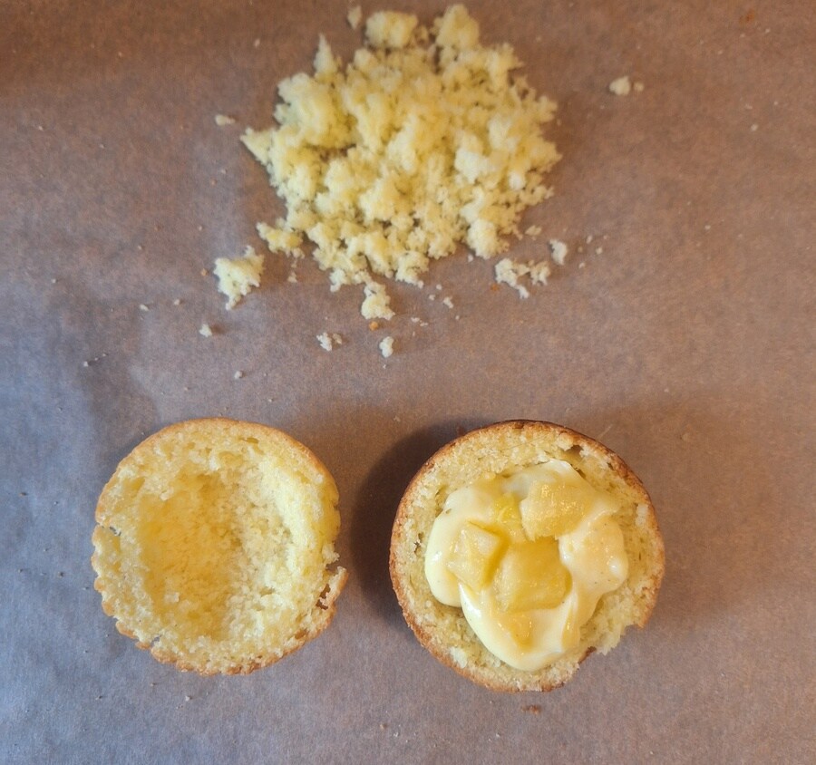 Füllen Sie die zentrale Muffinpartie mit der Creme und ergänzen Sie sie mit zwei oder drei Ananaswürfeln.