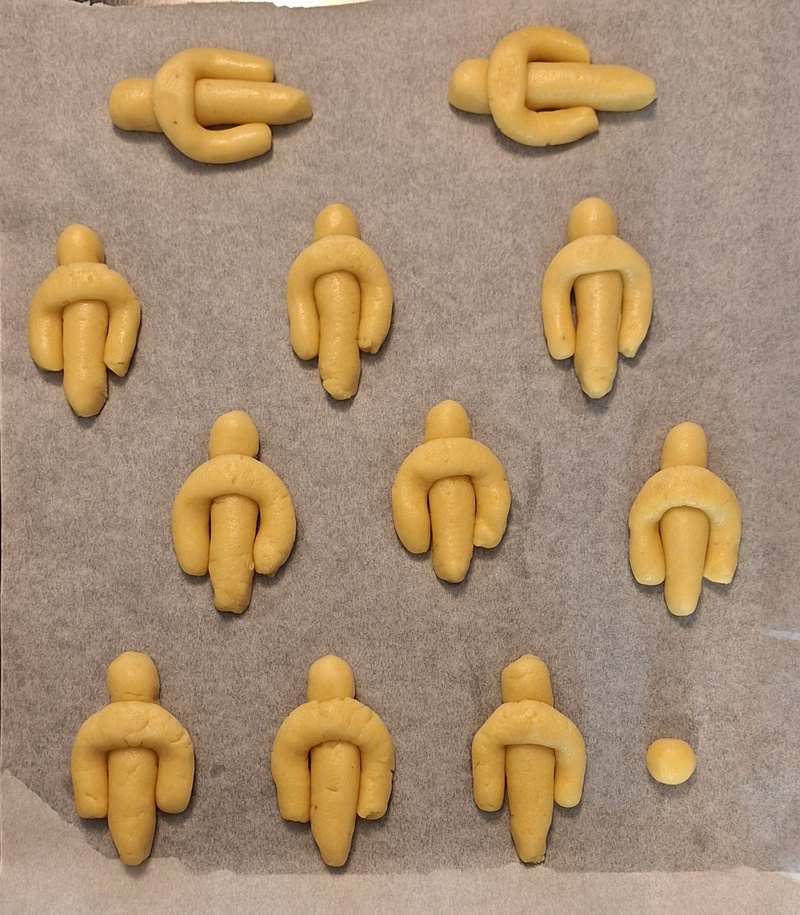 Den dickeren Zylinder nehmen und ca. 1 cm vom Ende eine kleine Vertiefung drücken. Den dünneren Strang zu einer U-Form biegen und in die Vertiefung legen, sodass Flügel entstehen. Das erste Täubchen ist fertig, aufs Backblech mit Backpapier legen.