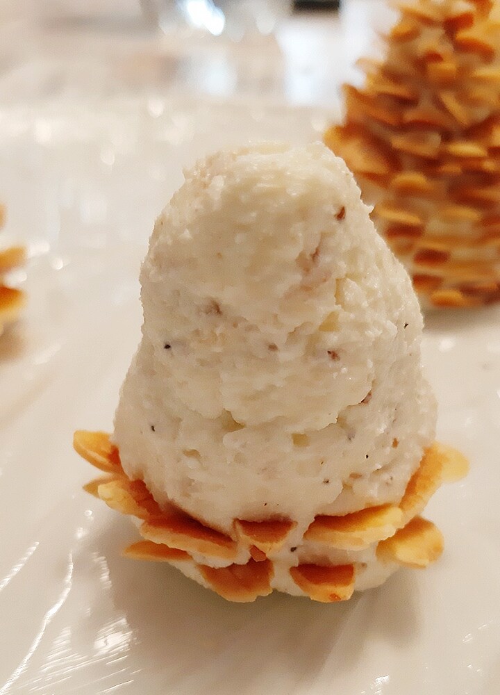 Als Basis habe ich Ricotta verwendet, kaufen Sie ihn am Frischestand, damit er fest und kompakt ist; ich rate von Ricotta im Becher ab, da er zu weich ist und Ihre Zapfen nicht stehen bleiben würden. Ich habe Robiola und Parmesan hinzugefügt, alles mit Olivenöl extra vergine, Salz und Pfeffer gewürzt und fein gehackte Walnüsse hinzugefügt, schließlich habe ich mit Mandelblättchen abgeschlossen. Wie Sie auf dem Foto sehen können, sind sie wirklich schön auf dem Tisch und haben einen reichhaltigen und raffinierten Geschmack, perfekt, um das Weihnachtsessen zu beginnen und Ihre Gäste zu überraschen.