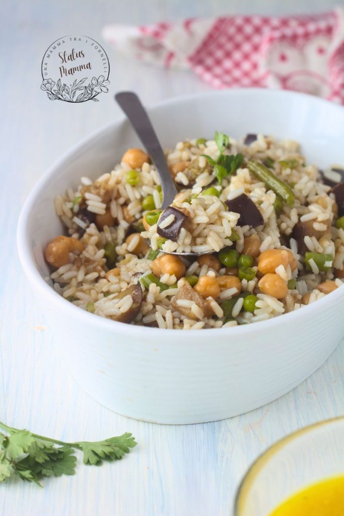 Die gekochten Kichererbsen, den Kreuzkümmel, die Paprika, Salz und Pfeffer hinzufügen und weitere 5 Minuten gut umrühren.In einer großen Schüssel den abgekühlten Reis, die Auberginen, die Zwiebel, die Paprika, die Erbsen und die Kichererbsen vermengen.