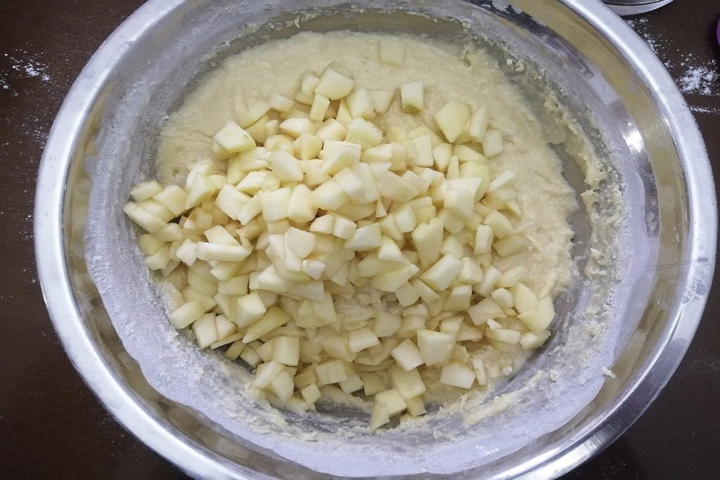 Dann heben wir die Apfelstückchen und die gehackten Mandeln unter.
