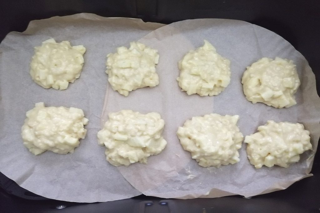 Den Korb der Heißluftfritteuse mit Backpapier auslegen und die Kekse mit Hilfe von zwei Löffeln formen.
