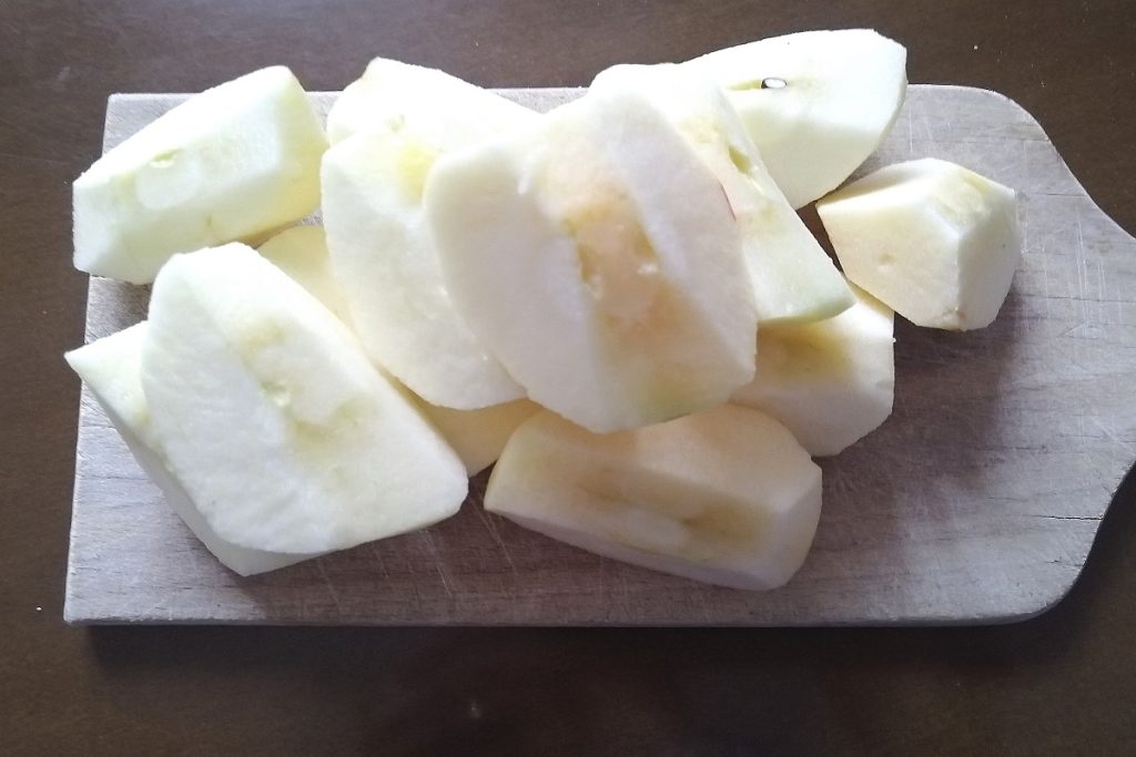 Schält die Äpfel, entfernt das Kerngehäuse und schneidet sie in Viertel, dann in kleine Würfel.