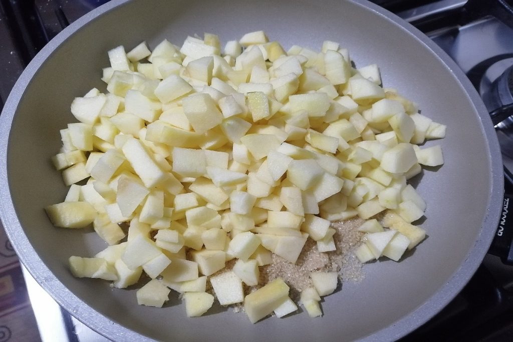 Fügt die Apfelwürfel, den Zitronensaft hinzu und streut etwas Zimt darüber.