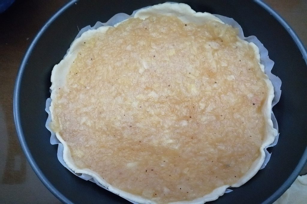 Gebt die Apfelmasse hinein und bedeckt sie mit der anderen Mürbeteigscheibe.