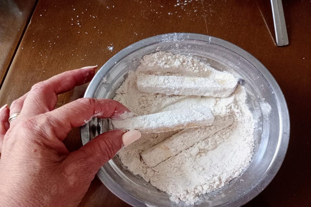 Für das Rezept habe ich gestreifte Auberginen verwendet, da ich sie zarter, süßer und schmackhafter finde. Es reicht, sie in Sticks zu schneiden, mit Salz zu würzen und vor dem Kochen zu mehlieren.