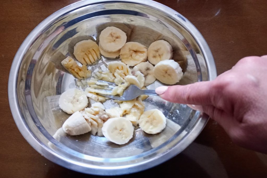 • Wir schneiden die Banane in Scheiben und zerdrücken sie gut mit einer Gabel.