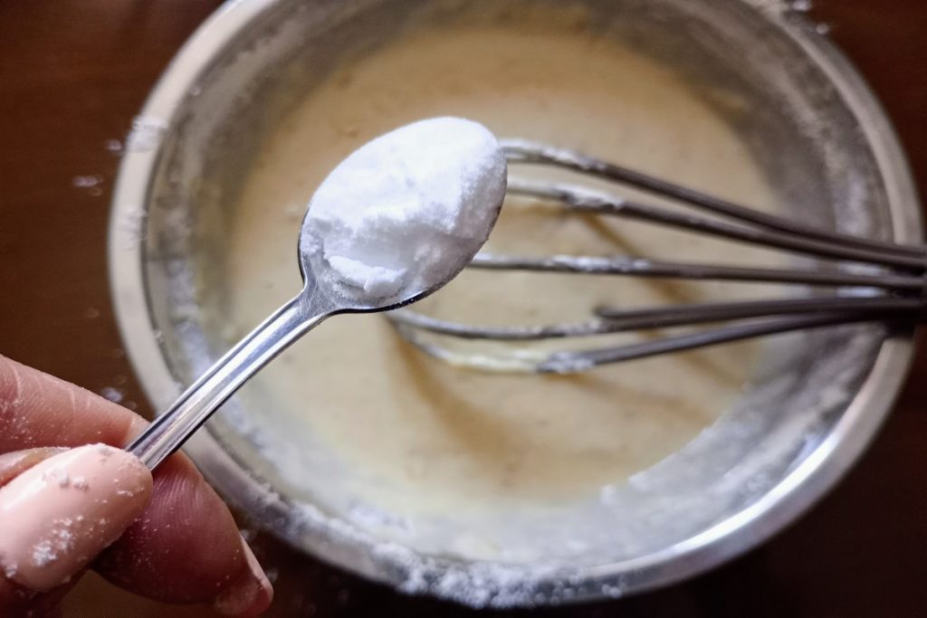 • Wir fügen den Honig und das Mehl hinzu, zum Schluss den Teelöffel Backpulver.