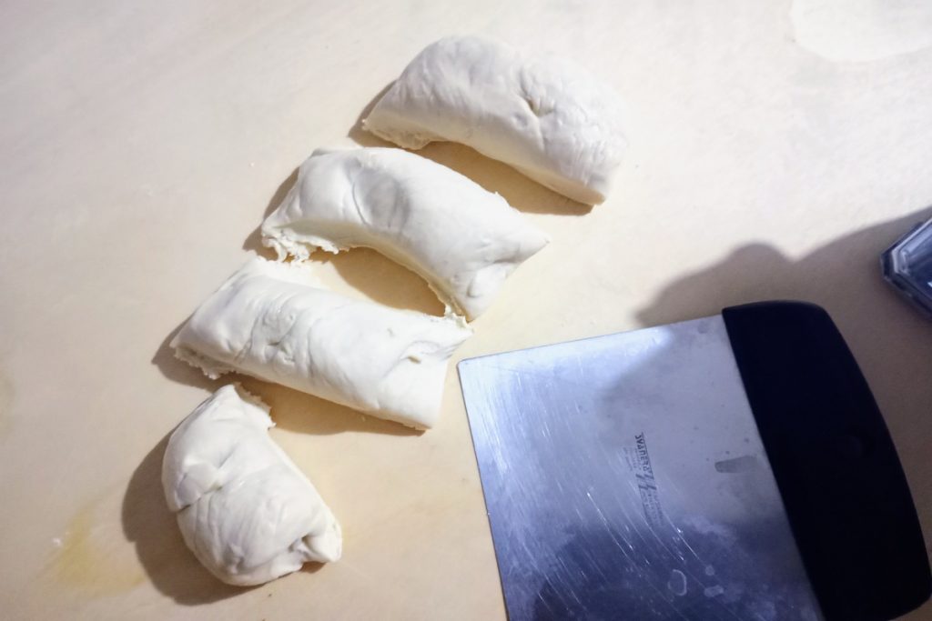 Nach der Ruhezeit den Teig herausholen und in kleine Portionen teilen.