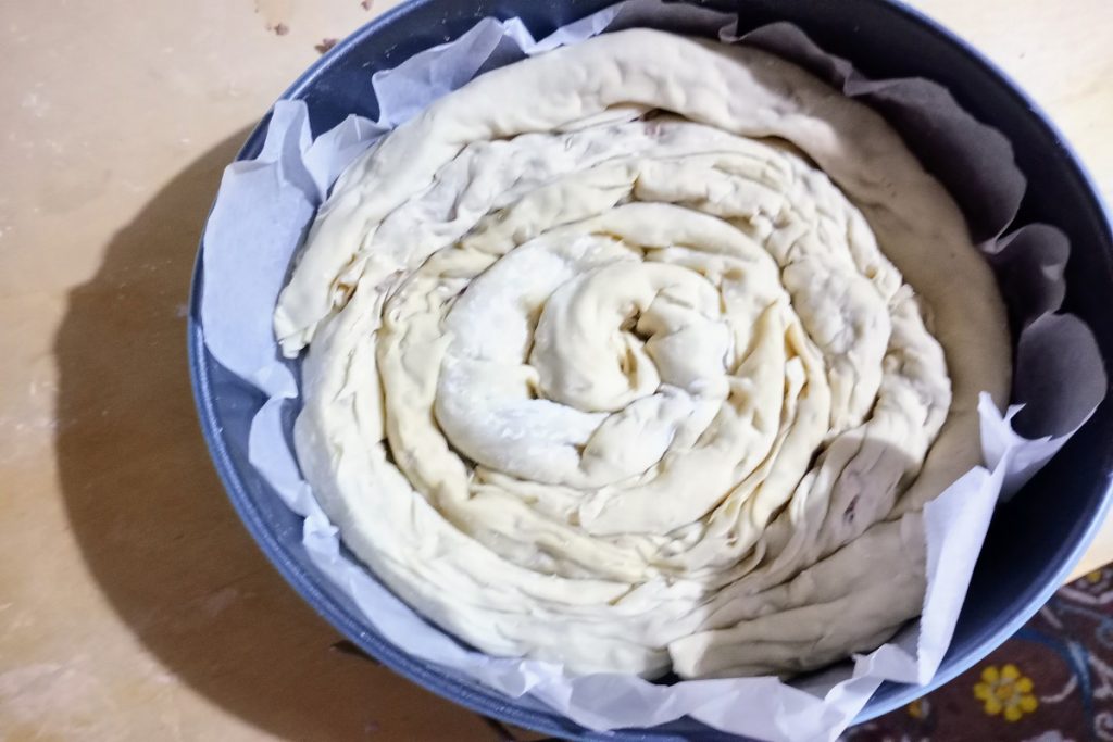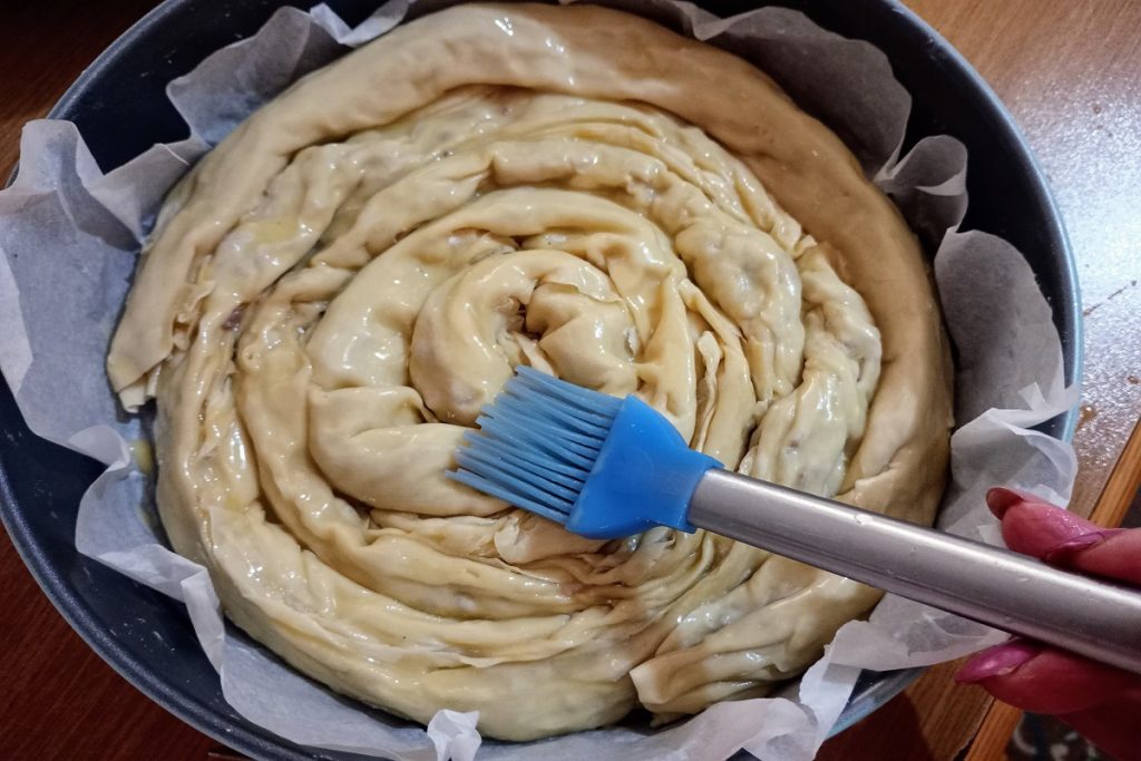Es wird mit übereinander geschichteten Filoteig-Schichten zubereitet, nachdem sie mit geschmolzener Butter bestrichen wurden, mit der Füllung in der Mitte gefüllt, geschlossen und wie eine Schnecke gerollt.