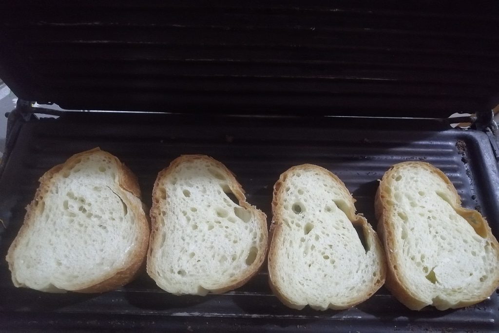Rösten Sie die Scheiben auf einer elektrischen Grillplatte, wenn Sie keine haben, geht auch ein Toaster, oder Sie können den Ofen oder eine Pfanne verwenden.