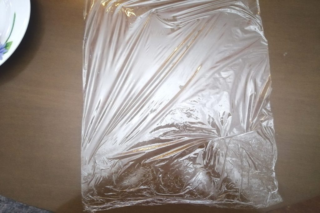 Frischhaltefolie auf die Arbeitsfläche legen und darauf aus der Kartoffelmasse ein Rechteck formen.