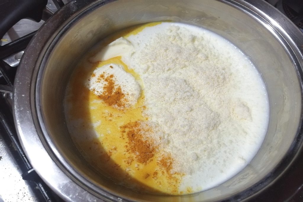 Wir gehen zur Zubereitung der Béchamelsoße über, indem wir die Milch in einen kleinen Topf gießen, eine Prise Salz, die Butter, die Löffel Grana und eine Prise Kurkuma hinzufügen, umrühren und zum Kochen bringen.