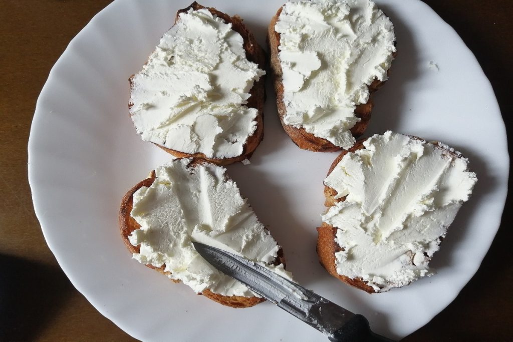 Lassen Sie die Scheiben abkühlen und streichen Sie dann eine Schicht Robiola darüber.