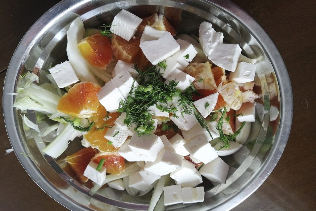 Vermengen Sie die Zutaten in einer Schüssel, indem Sie etwas fein geschnittenes Fenchelgrün hinzufügen.