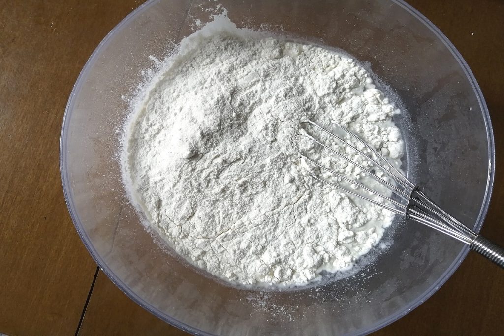 Mehl und Wasser in eine Schüssel geben und mit einem Schneebesen verrühren, dann Salz hinzufügen.
