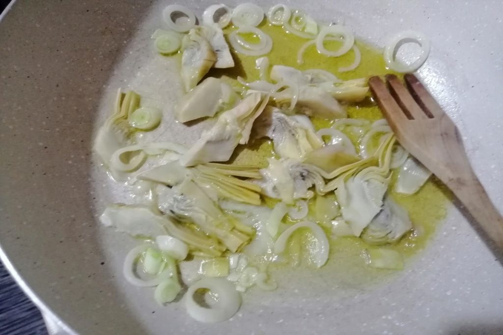 Wenn die Zwiebel angedünstet ist, fügen wir die Artischocken hinzu und lassen sie sanft für 3-4 Minuten kochen, dabei häufig umrühren.