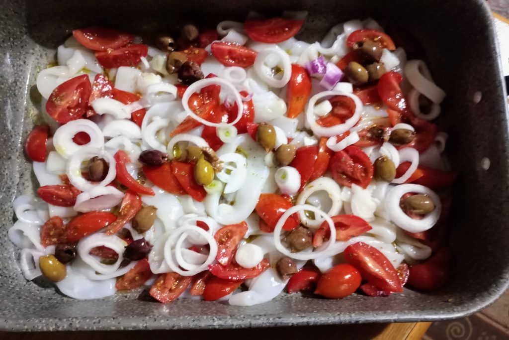 Das ideale Rezept für den Sommer, aber es passt zu jeder Jahreszeit, die gebackenen Tintenfischringe mit Tropea-Zwiebel, Tomaten und Oliven werden Sie sicher nicht enttäuschen!