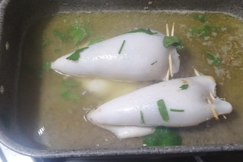 Die Tintenfische werden, nachdem sie ausgehöhlt und gereinigt wurden, mit einer Füllung aus Brotkrumen und fein gehackten Tentakeln gefüllt.