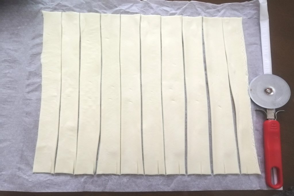 • Den Blätterteig auf dem Tisch ausrollen und mit einem Teigrad 12 senkrechte Streifen schneiden. Die Streifen halbieren.