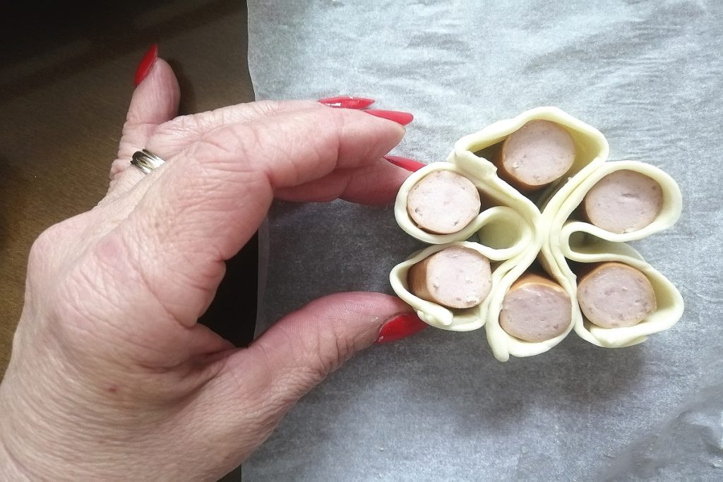Die Blätterteig-Blüten lassen sich nach Lust und Geschmack variieren. Ich habe nur Würstchen verwendet, aber man kann Würstchen mit entsteinten schwarzen und grünen Oliven abwechseln.