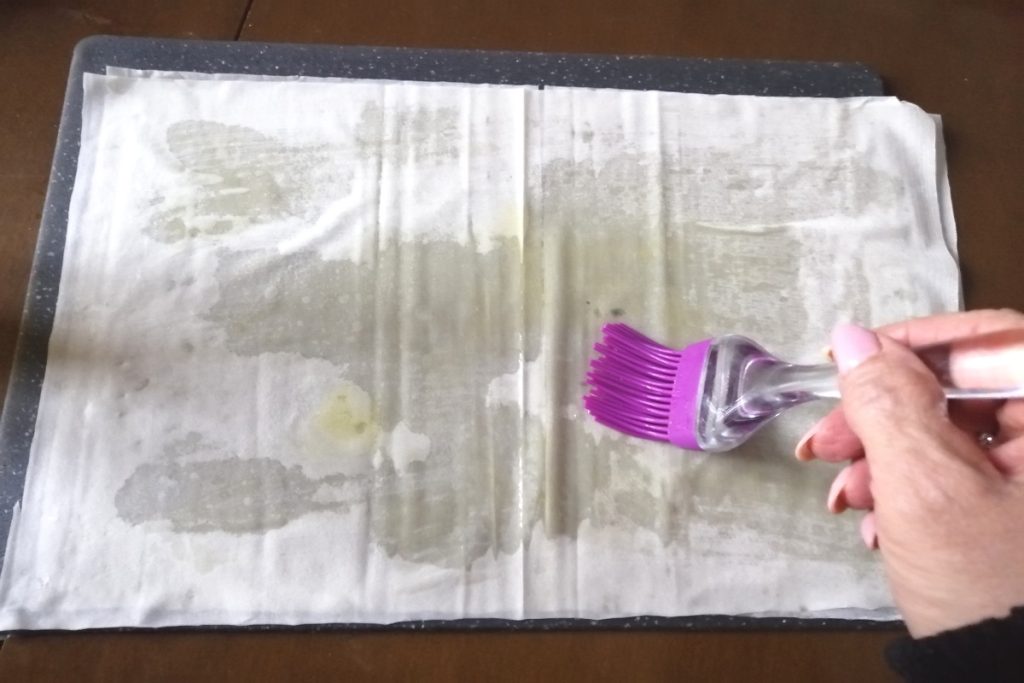 • Auf einer Arbeitsfläche ein Filoteigblatt ausbreiten und leicht mit Öl bestreichen.