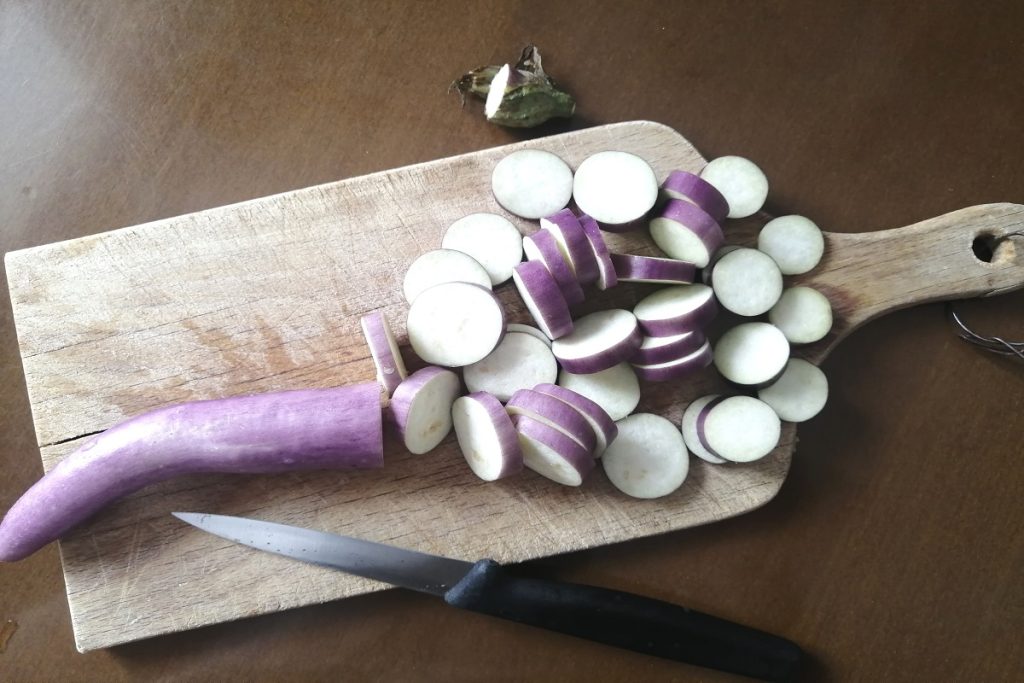 Weiter geht’s mit den Auberginen: waschen, den Stiel entfernen und dann in Scheiben schneiden.