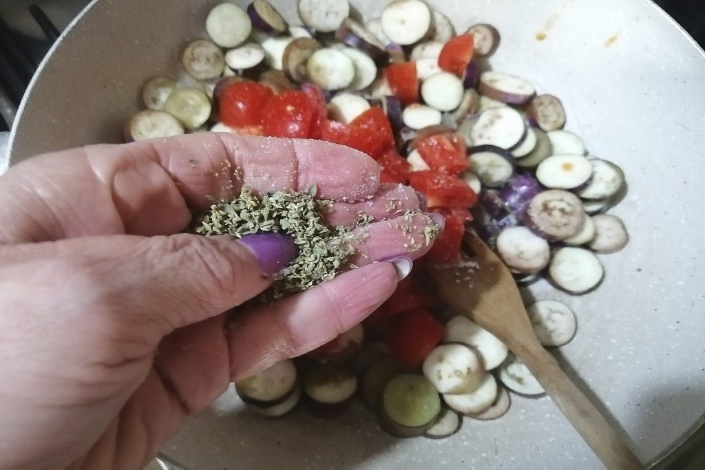 10 bis 15 Minuten kochen lassen, gelegentlich umrühren, bei Bedarf während des Kochens etwas Wasser hinzufügen, da dieser Auberginentyp nicht wässrig ist.
