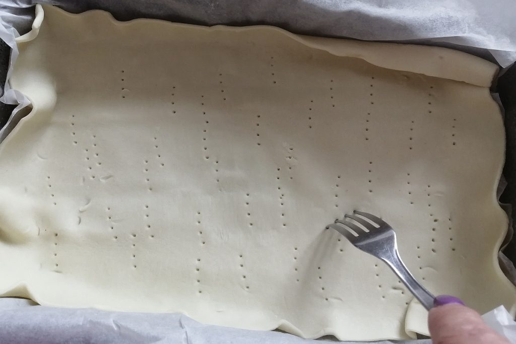 Öffnen Sie die Blätterteigrolle und legen Sie sie in eine Backform, stechen Sie den Boden mit einer Gabel ein.