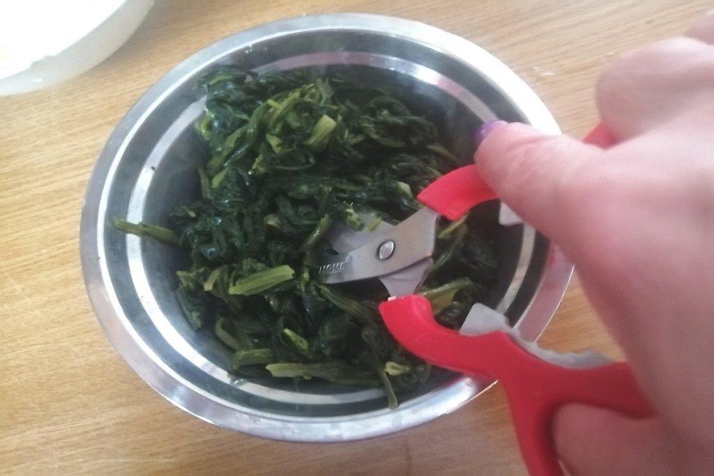 Den Spinat mit einer Schere schneiden.