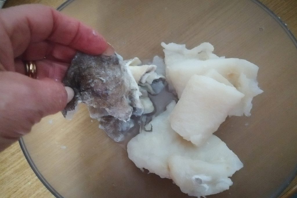 Wir entfernen die Haut von den Kabeljau-Stücken, schneiden sie in kleine Stücke und geben sie in einen Mixer-Becher zum Zerkleinern.