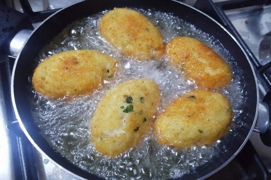 Wir stellen eine Pfanne auf den Herd mit Sonnenblumenöl, wenn es heiß ist, tauchen wir die Frikadellen für die Zubereitung ein.