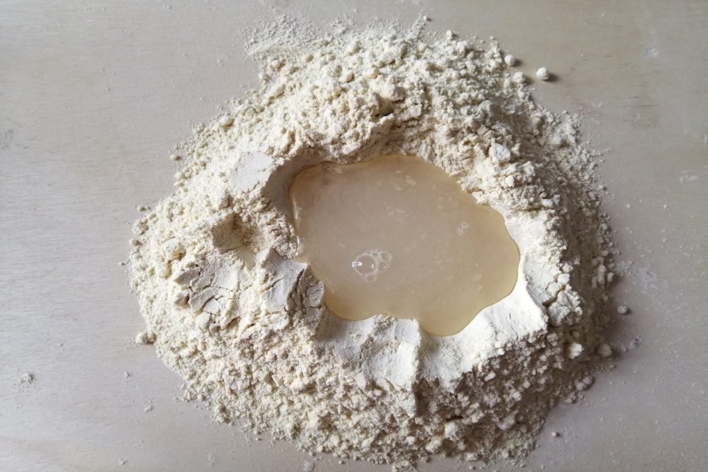 Auf einem Nudelbrett das Kichererbsenmehl geben und eine Mulde in der Mitte formen, in die das Wasser gegossen wird.