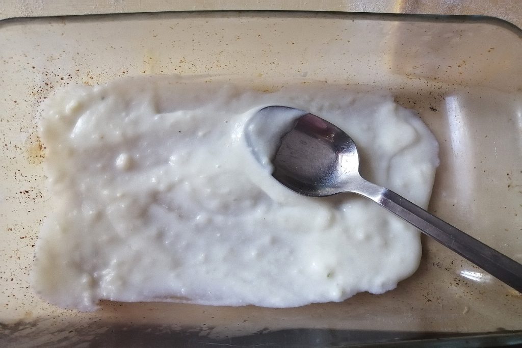 In der Zwischenzeit eine Mischung aus Mehl und Wasser zubereiten, die in die Milch gegeben wird, sobald sie zu kochen beginnt.