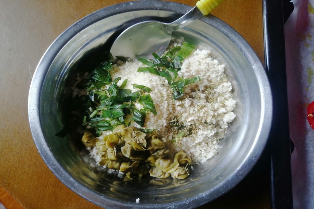 Bereiten Sie das Paniermehl zu, indem Sie den geriebenen Käse, Oregano, fein geschnittenes Basilikum und gespülte und ausgedrückte Kapern zu den Brotkrümeln geben, alles mischen.
