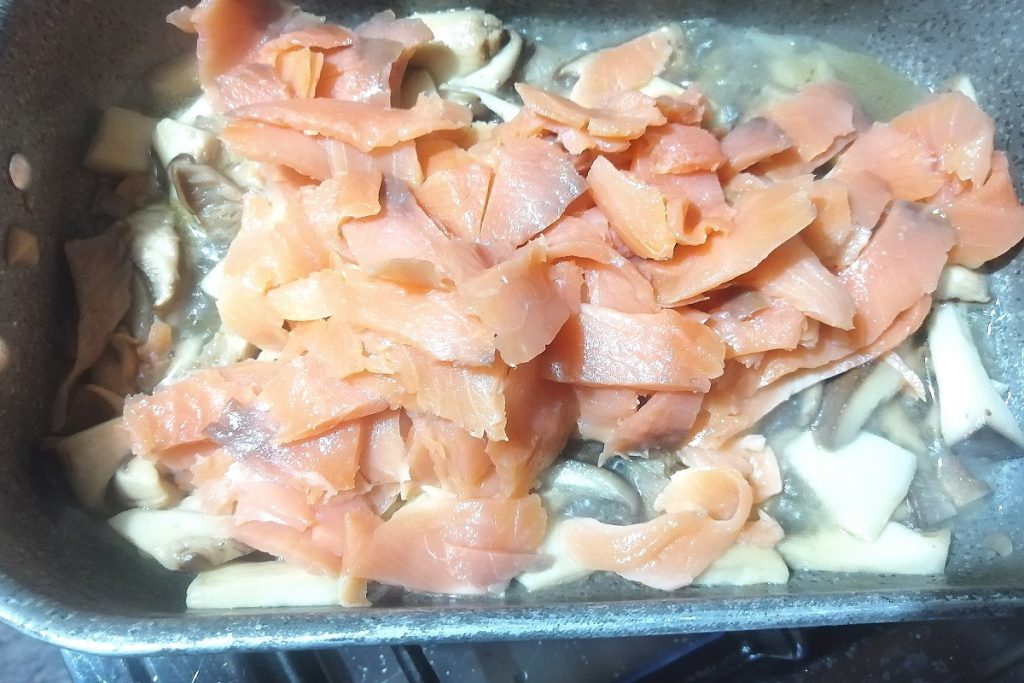 • Die Cardoncelli-Pilze putzen und in Scheiben schneiden, den Lachs in kleine Stücke schneiden.
