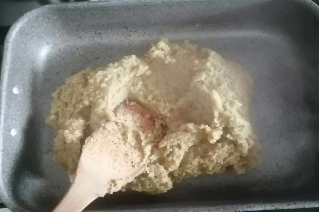 Wenn die Polenta gekocht ist, geben Sie sie in eine rechteckige Form, lassen Sie sie abkühlen und stellen Sie sie dann für ein paar Stunden in den Kühlschrank.