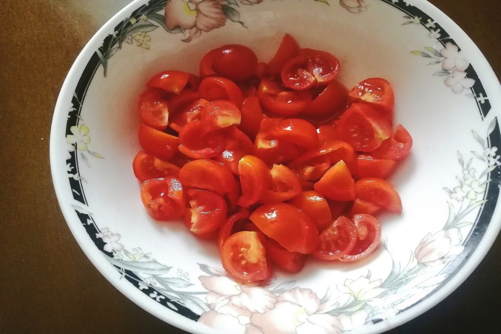 In der Zwischenzeit bereiten wir die Füllung vor. Waschen und schneiden wir die Kirschtomaten.