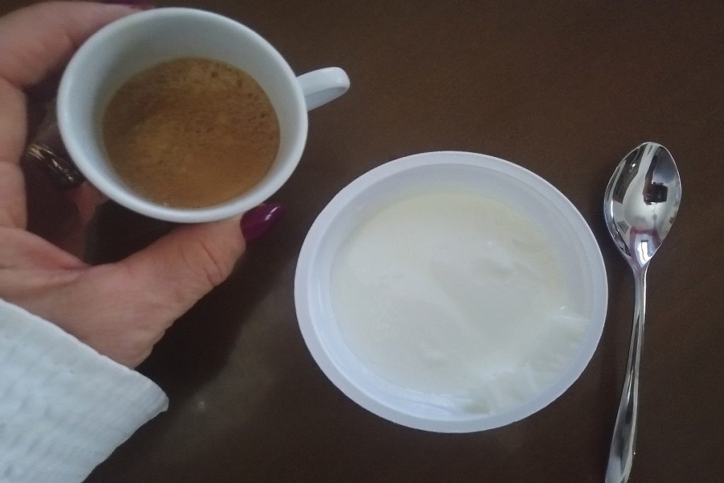 • Gießt den Kaffee in den Joghurt und mischt.
