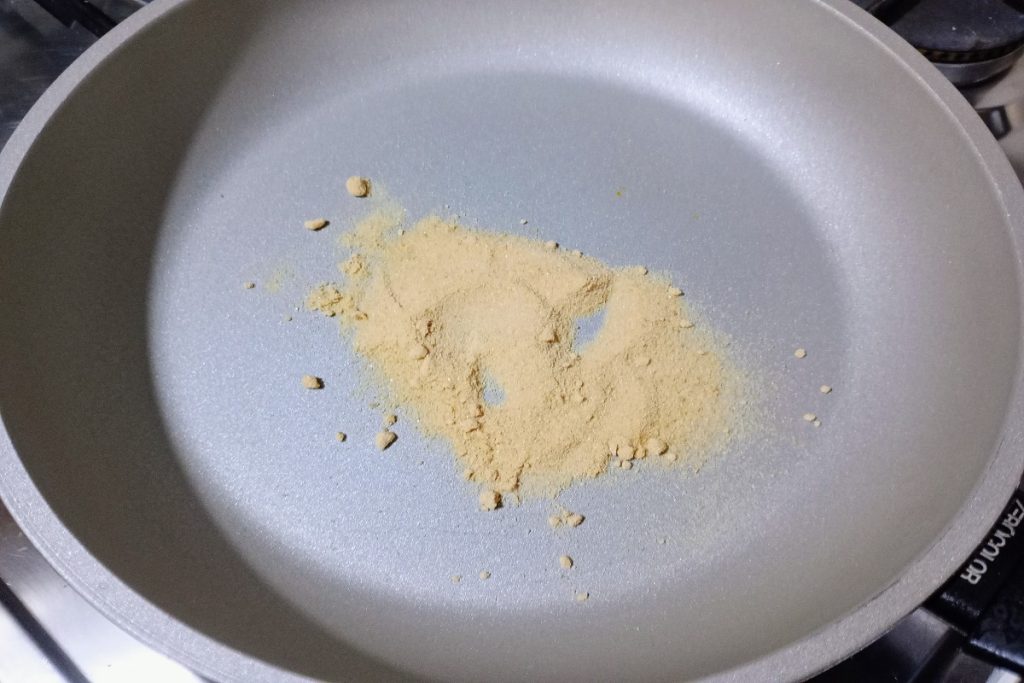 Stellen wir eine Pfanne auf den Herd und geben wir die zwei Esslöffel Rohrzucker hinein.