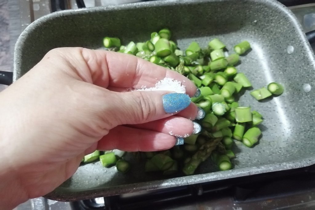 Wir reinigen den Spargel, indem wir das harte Ende entfernen, waschen ihn und schneiden ihn in kleine Stücke.