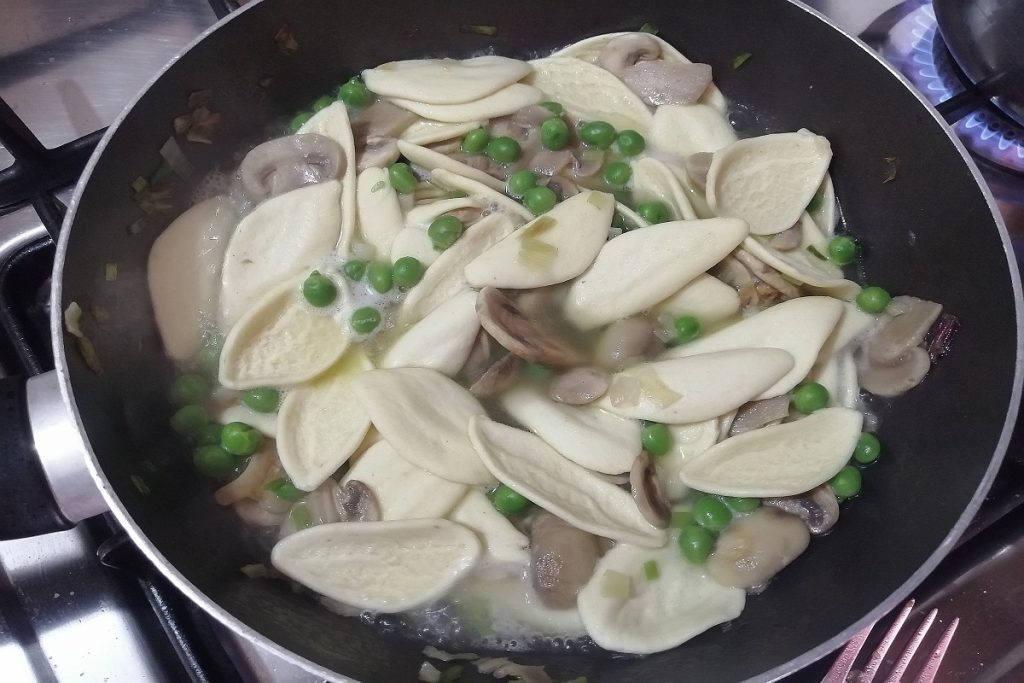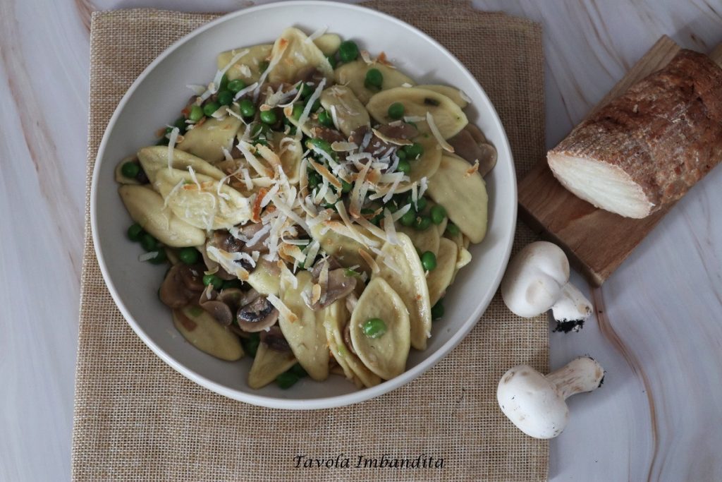 Die Olivenblätter mit Champignons und Erbsen sind ein vielseitiges Gericht, das sich für unerwartete Gäste und vegetarische Freunde eignet.