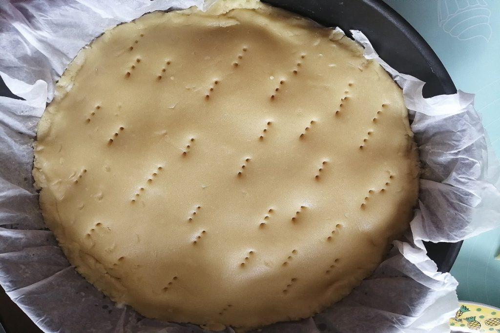 Den Mürbeteig hineinlegen und den Boden des Mürbeteigs mit einer Gabel einstechen.
